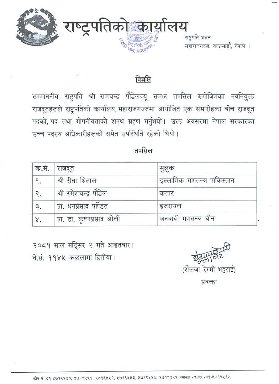 पाकिस्तानका लागि नेपाली राजदूत रीता धिताल, कतारका लागि नेपाली राजदूत रमेशचन्द्र पौडेल, इजरायलका लागि नेपाली राजदूत धनप्रसाद पण्डित र चीनका लागि नेपाली राजदूत प्रा।डा। कृष्णप्रसाद ओलीले राष्ट्रपति रामचन्द्र पौडेल समक्ष पद तथा गोपनीयताको शपथग्रहण गरेका हुन् ।