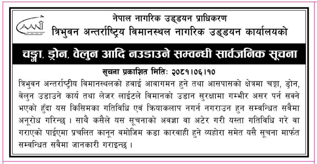 विमानस्थलअन्तर्गतको नागरिक उड्डयन कार्यालयले सूचना जारीगरी चङ्गा, ड्रोन वा बेलुन नउडाउन आग्रह गरेको हो ।
