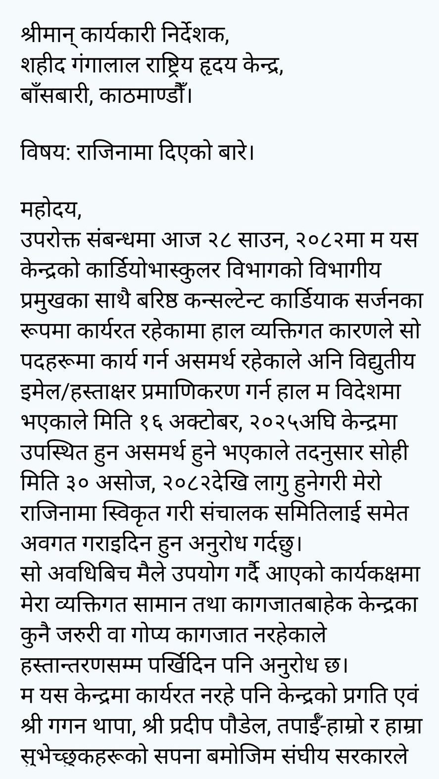 राजीनामा पत्रमा डा. कोइरालाले १६ अक्टोबर २०२५ सम्म केन्द्रमा उपस्थित हुन नसक्ने र आफ्नो व्यक्तिगत सामानबाहेक केन्द्रमा कुनै जरुरी वा गोप्य कागजात नरहेको उल्लेख गरेका छन्। उनले केन्द्रको प्रगति, पूर्व स्वास्थ्य मन्त्री गगन थापा, हालका स्वास्थ्य मन्त्री प्रदीप पौडेल लगायतको सपना तथा स्वास्थ्य सेवाप्रति संघीय सरकारको प्रतिबद्धता निरन्तर रहोस् भन्ने शुभकामना पनि व्यक्त गरेका छन्।