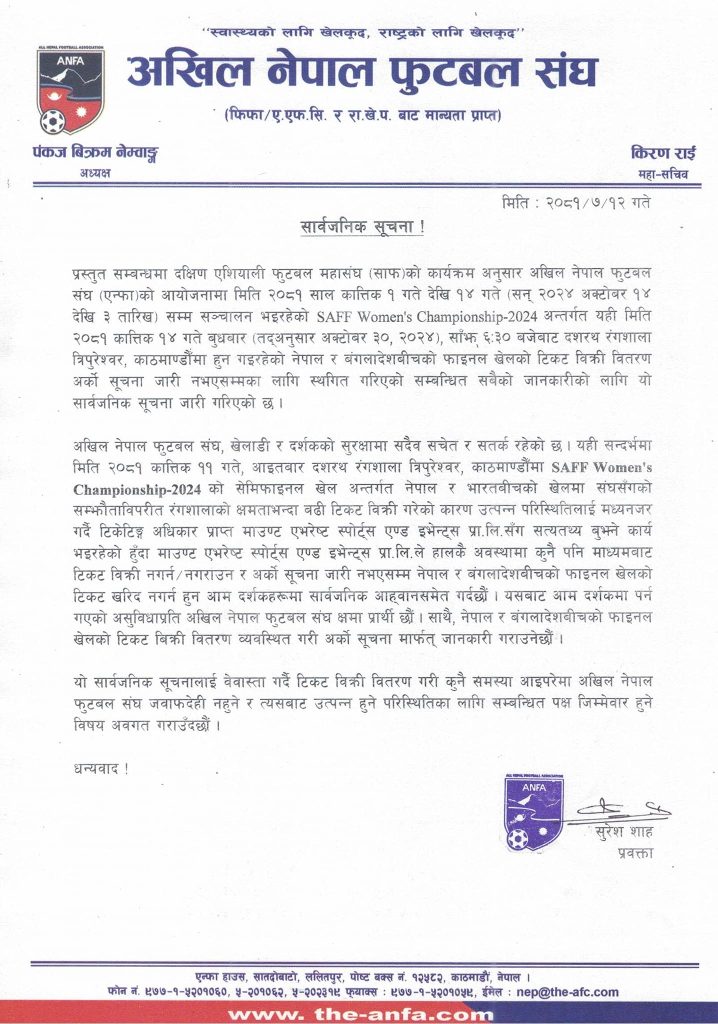 काठमाडौं । अखिल नेपाल फुटबल संघ (एन्फा) ले बुधबार हुने नेपाल र बंगलादेशबीचको साफ महिला च्याम्पियनसिपको टिकट बिक्री बन्द गरेको छ ।