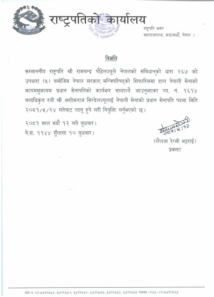 काठमाडौं । नेपाली सेनाका बलाधिकृत अशोकराज सिग्देल प्रधानसेनापतिमा नियुक्त भएका छन् । राष्ट्रपति रामचन्द्र पौडेलले कायममुकायम प्रधानसेनापतिको काम गर्दै आएका सिग्देललाई प्रधानसेनापतिमा बुधबार नियुक्त गरेका हुन् ।