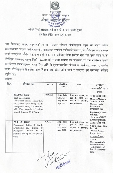 विभागले भारतको साइकोट्रपिक इन्डिया लिमिटेडको पिल्प्यान ४०, पेन्टोप्राजोल ट्याब्लेटको एमजीको ब्याच नम्बर सीआई६४३००८ को बिक्रीवितरणमा रोक लगाएको छ । यस औषधिको आयातकर्ता शारदा मेड्केयर ट्रेडर्स प्रालि काठमाडौं रहेको विभागले जनाएको छ ।