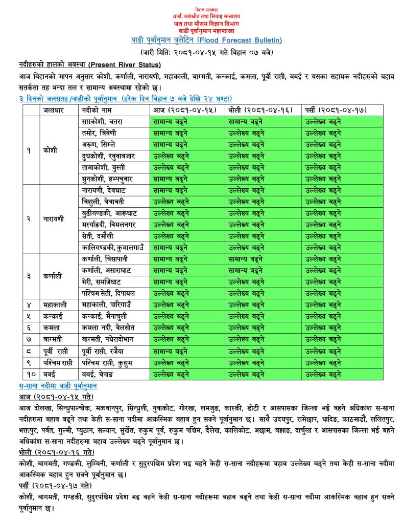 साथै आज उदयपुर, रामेछाप, धादिङ, काठमाडौँ, ललितपुर, भक्तपुर, पर्वत, गुल्मी, प्युठान, सल्यान, सुर्खेत, रुकुमपूर्व, रुकुमपश्चिम, दैलेख, कालिकोट, अछाम, बझाङ, दार्चुला र आसपासका जिल्ला भई बहने अधिकांश ससाना नदीमा बहाव बढ्ने अनुमान छ। महाशाखाले भनेको छ– सतर्कता अपनाइराखौँ।