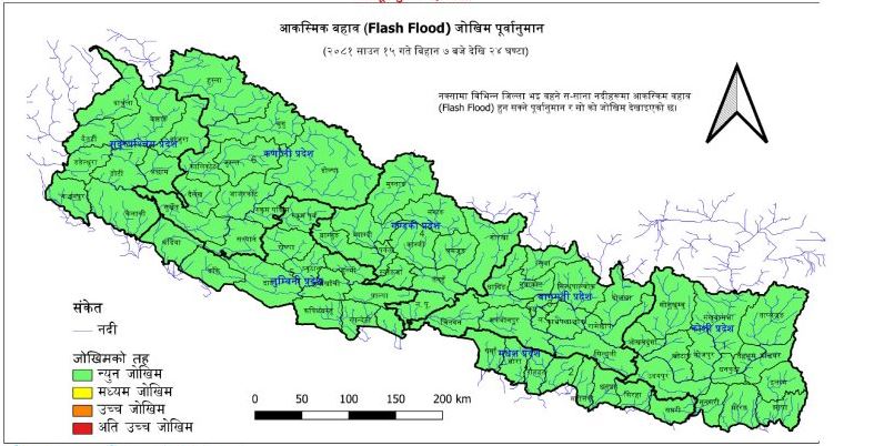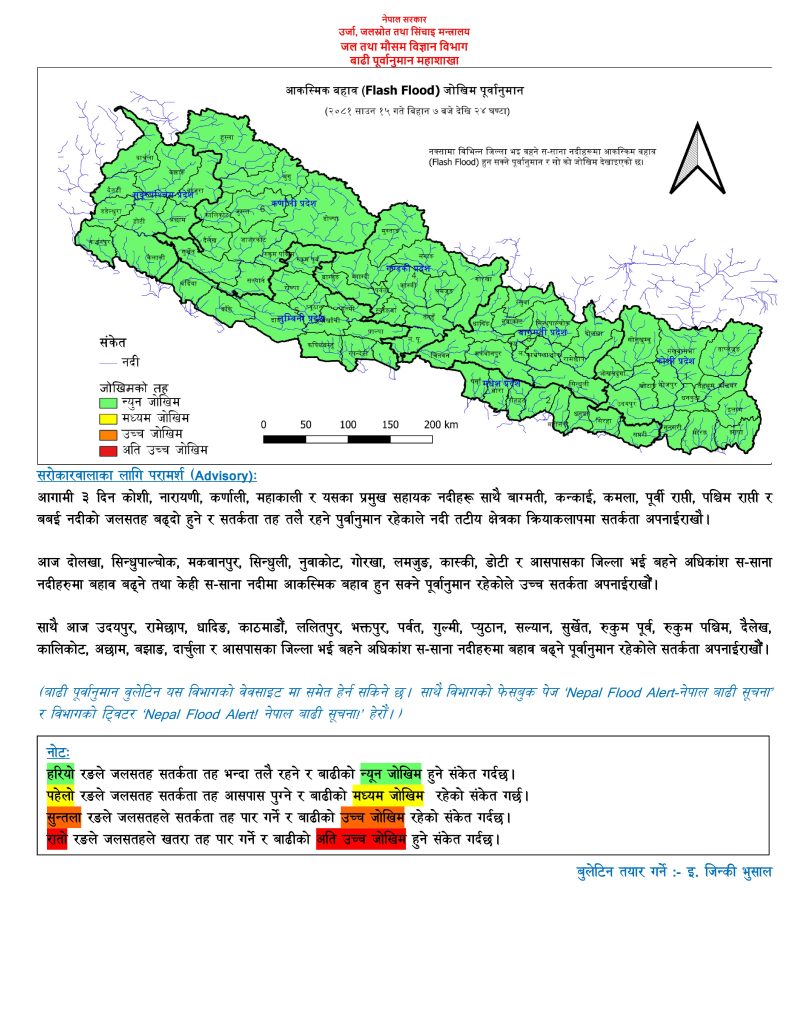 महाशाखाका अनुसार आज दोलखा, सिन्धुपाल्चोक, मकवानपुर, सिन्धुली, नुवाकोट, गोरखा, लमजुङ, कास्की, डोटी र आसपासका जिल्ला भई बहने अधिकांश ससाना नदीमा बहाव बढ्ने तथा केहीमा आकस्मिक बहाव हुनसक्ने अनुमान छ। महाशाखाले भनेको छ– उच्च सतर्कता अपनाईराखौँ।