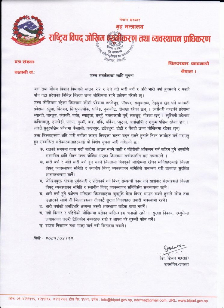 प्राधिकरणले उच्च जोखिमका जिल्लामा जुनसुकै बेला विपद् आउनसक्ने हुनाले खोज तथा उद्धारका लागि ती जिल्लाहरुका तीनवटै सुरक्षा निकायलाई तयारी अवस्थामा रहने, भारी वर्षाको अवधिभरि अत्यन्त जरुरी अवस्थामा बाहेक यात्रा नगर्न, नदी किनार र पहिरोको जोखिममा बसेका बासिन्दालाई चनाखो रहन आग्रह गरेको छ।