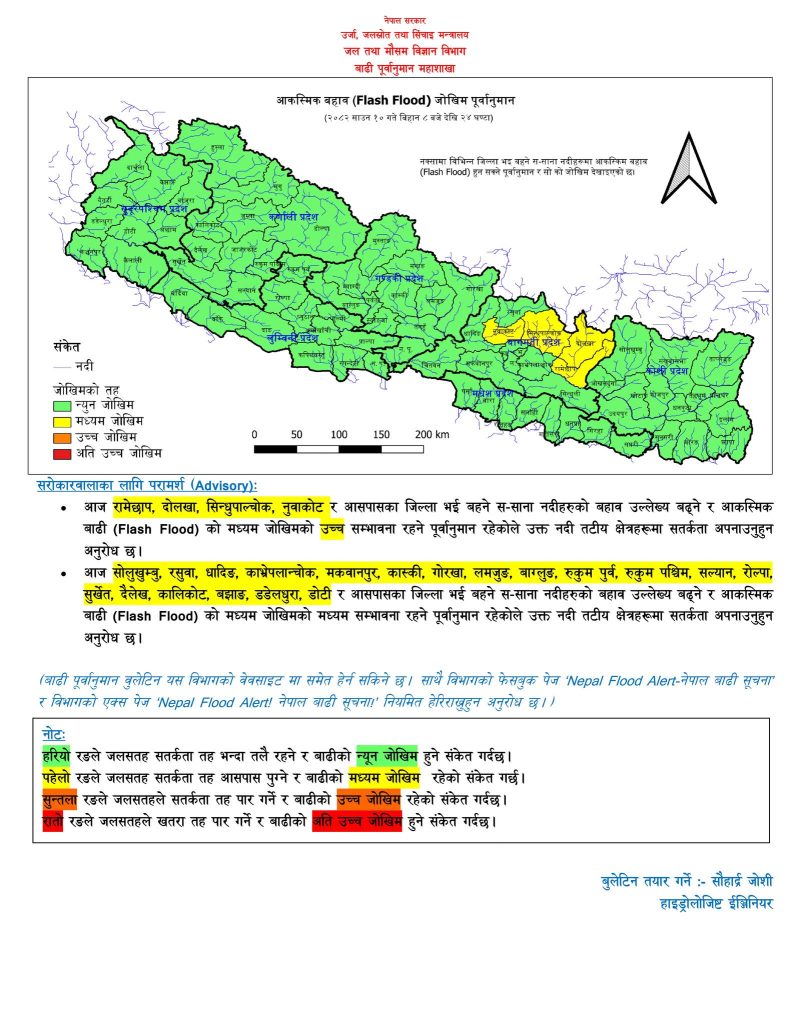 बाढी पूर्वानुमान महाशाखाले रामेछाप, दोलखा, सिन्धुपाल्चोक, नुवाकोट लगायत आसपासका क्षेत्रमा बहने साना नदीहरूमा बाढीको बहाव उल्लेख्य रूपमा बढ्ने र आकस्मिक बाढीको उच्च सम्भावना रहेको जनाएको छ।