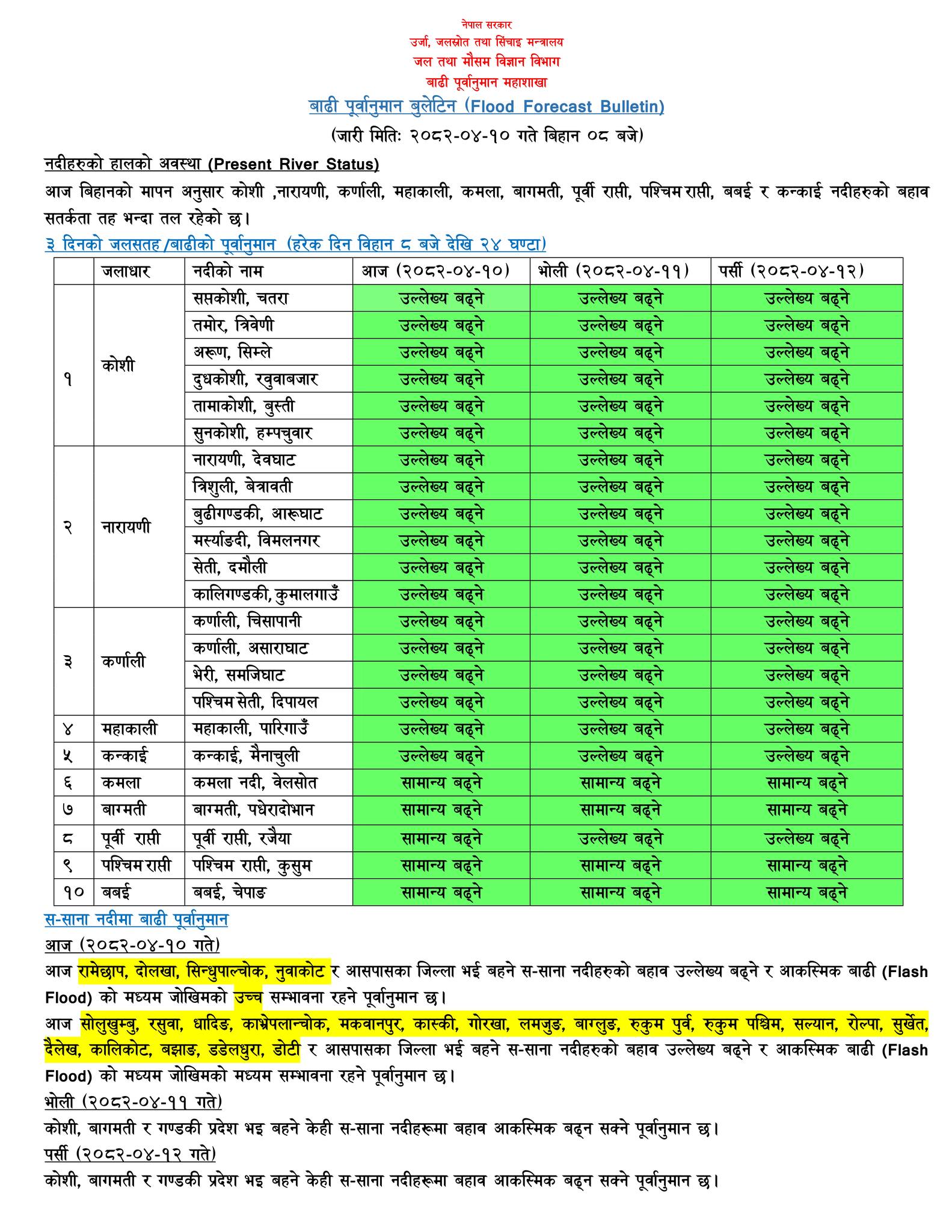 महाशाखाका अनुसार आज बिहान बाढी मापन गर्दा प्रमुख ठूला नदीहरू कोसी, नारायणी, कर्णाली, महाकाली, कमला, बागमती, पूर्वी राप्ती, पश्चिम राप्ती, बबई र कन्काईको बहाव हाल सतर्कता तहभन्दा तल रहे पनि दिनभरमा ती नदीहरूको बहाव बढ्ने अनुमान गरिएको छ।