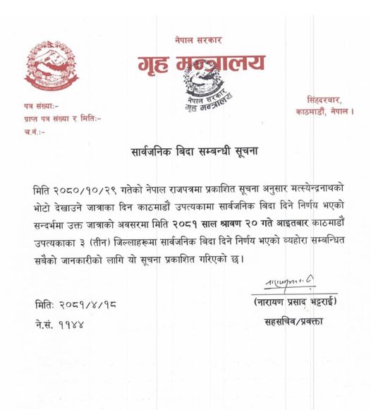 काठमाडौं । सरकारले यही साउन २० गते आइतबार काठमाडौं उपत्यकामा सार्वजनिक दिन निर्णय गरेको छ। उक्त दिन मत्स्येन्द्रनाथको भोटो देखाउने दिन परेकोले सार्वजनिक बिदा दिने निर्णय भएको गृह मन्त्रालयले जनाएको छ।