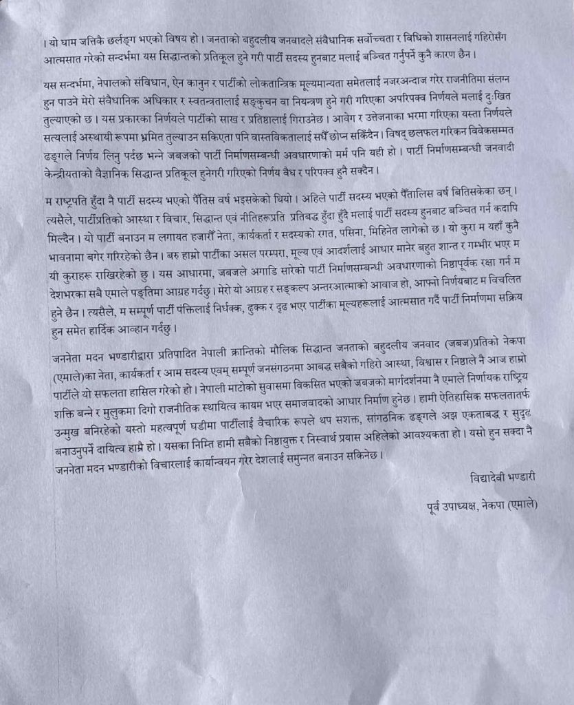 एमालेले सदस्यता नवीकरण अस्वीकार गरेको निर्णयपछि आयोजित पत्रकार सम्मेलनमा बोल्दै भण्डारीले भने, “म राष्ट्रकै सर्वोच्च पदमा पुगेर इतिहासमा आफ्नो नाम दर्ज गरिसकेको छु। अब पदको लालसा छैन। पार्टीलाई सफल, सुदृढ र एकताबद्ध बनाउन मैले सदस्यता नवीकरण गरेकी हुँ।”