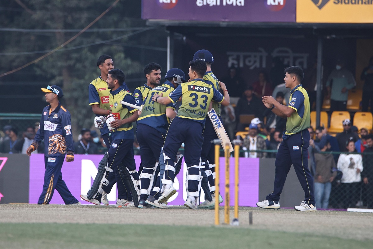 क्रिस सोलले ४ बलमा नट आउट १४ रन बनाए । लुम्बिनीका लागि दुर्गेश गुप्ताले ३ तथा साद विन जाफर र रामोन सिमन्सले समान २ तथा विवेक यादवले १ विकेट लिए ।