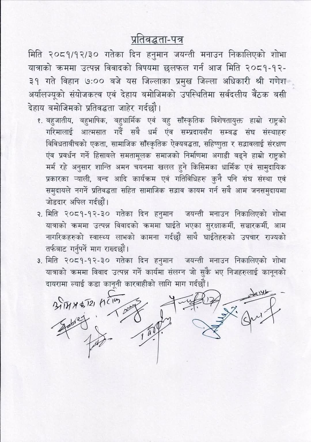 जिल्ला प्रशासन कार्यालय पर्सामा बसेको सो बैठकमा दलका प्रतिनिधिहरूले सबै धर्म एवम् सम्प्रदाय सम्बद्ध सङ्घ संस्थाहरू विविधताबिचको एकता, सामाजिक सांस्कृतिक ऐक्यबद्धता, सहिष्णुता र सदभावलाई संरक्षण एवम् प्रवर्द्धन गर्ने हिसाबले समतामूलक समाजको निर्माणमा अगाडि बढ्ने राष्ट्रको मर्म रहेअनुसार शान्ति, अमनचयनमा खलल हुने किसिमका धार्मिक एवम् सामुदायिक प्रकारका र्याली, बन्द आदि कार्यक्रम एवम् गतिविधिहरू कुनै पनि सङ्घ संस्था एवम् समुदायले नगर्ने प्रतिबद्धतासहित सद्भाव कायम गर्न सबैमा अपिल गरेका छन् ।