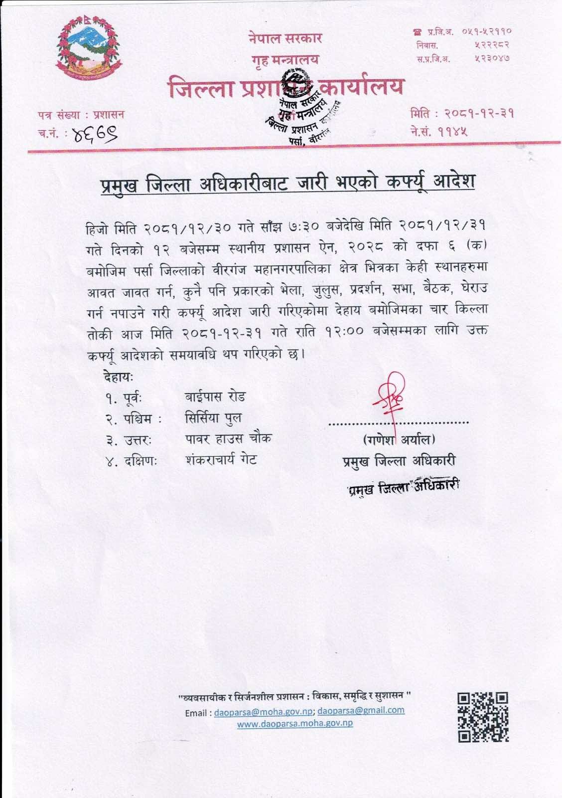 आज मध्याह्न १२ः०० बजेसम्मका लागि जारी भएको निषेधाज्ञाको समय बढाएर भरे मध्यरात १२ः०० बजेसम्म निषेधाज्ञा जारी गरिएको हो। पर्साका प्रमुख जिल्ला अधिकारी गणेश अर्यालले शनिबार साँझ ७ः३० बजेदेखि आइतबार १२ः०० बजेसम्मका लागि जारी भएको कर्फ्युको समय आज राति १२ः०० बजेसम्मका लागि बढाएको जानकारी दिए।