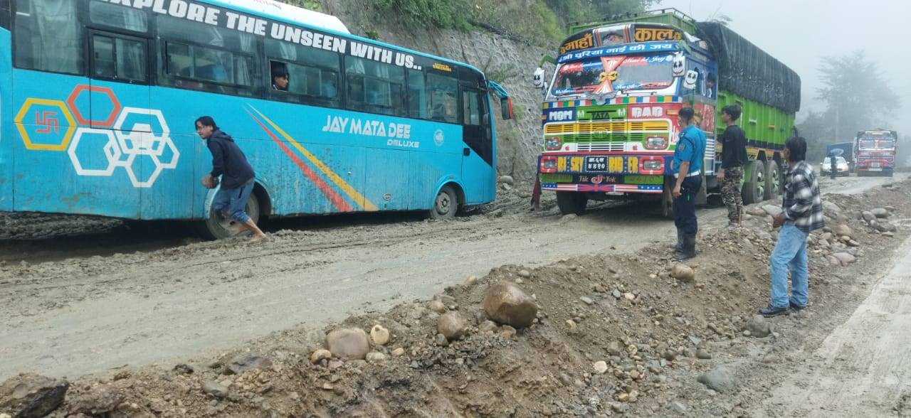 उनले भने, ‘बिहानैदेखि परेको पानीका कारण बाटो हिलो र चिप्लो हुँदा सवारीसाधन पश्चिमतर्फ जान सकेका छैनन् । दाउन्ने खण्डमा मालवाहक सवारीसाधन उकालो चढ्न नसकेपछि यस खण्डमा जाम हुन नदिन प्रहरी खटिएका छन् ।’