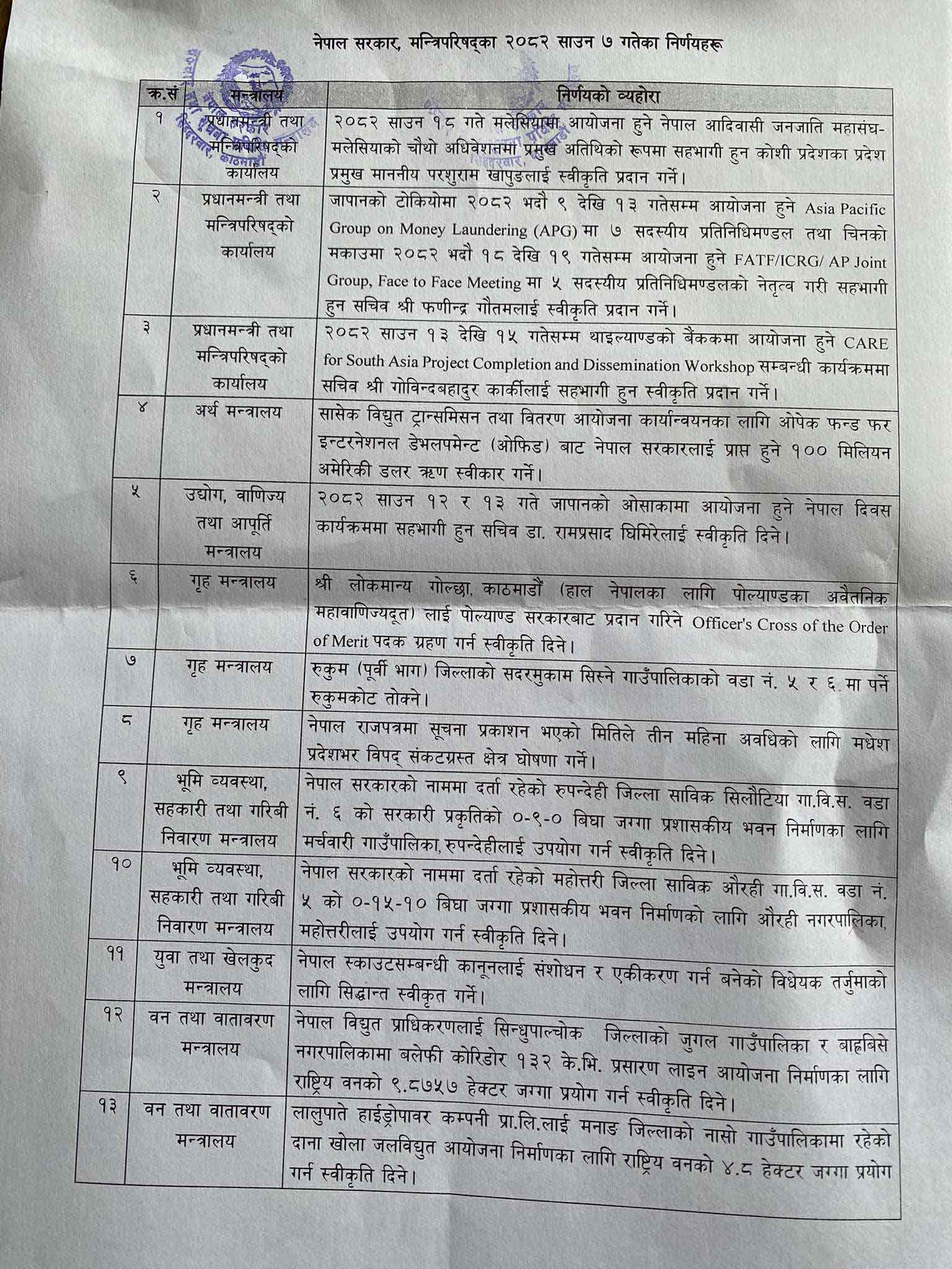 मन्त्री गुरुङले साउन ७ गते बसेको मन्त्रिपरिषद् बैठकका १३ वटा निर्णय सार्वजनिक गरेका छन् ।