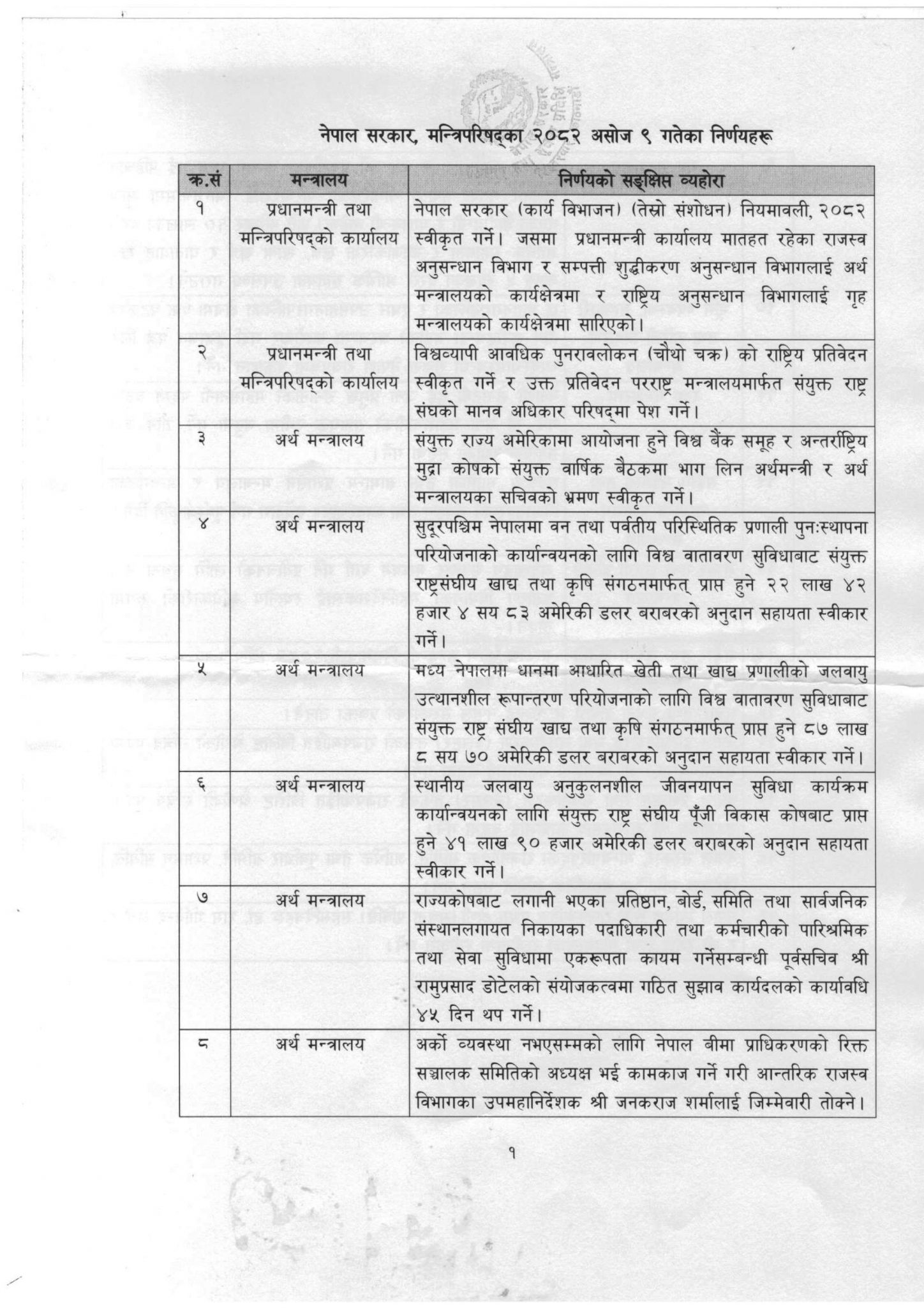 काठमाडौं । बिहीबारको मन्त्रिपरिषद् बैठकका निर्णय सार्वजनिक गरिएको छ । सञ्चारमन्त्री जगदीश खरेलले शुक्रबार मन्त्रालयमा पत्रकार सम्मेलनमार्फत् १९ वटा निर्णय सार्वजनिक गरेका छन् ।