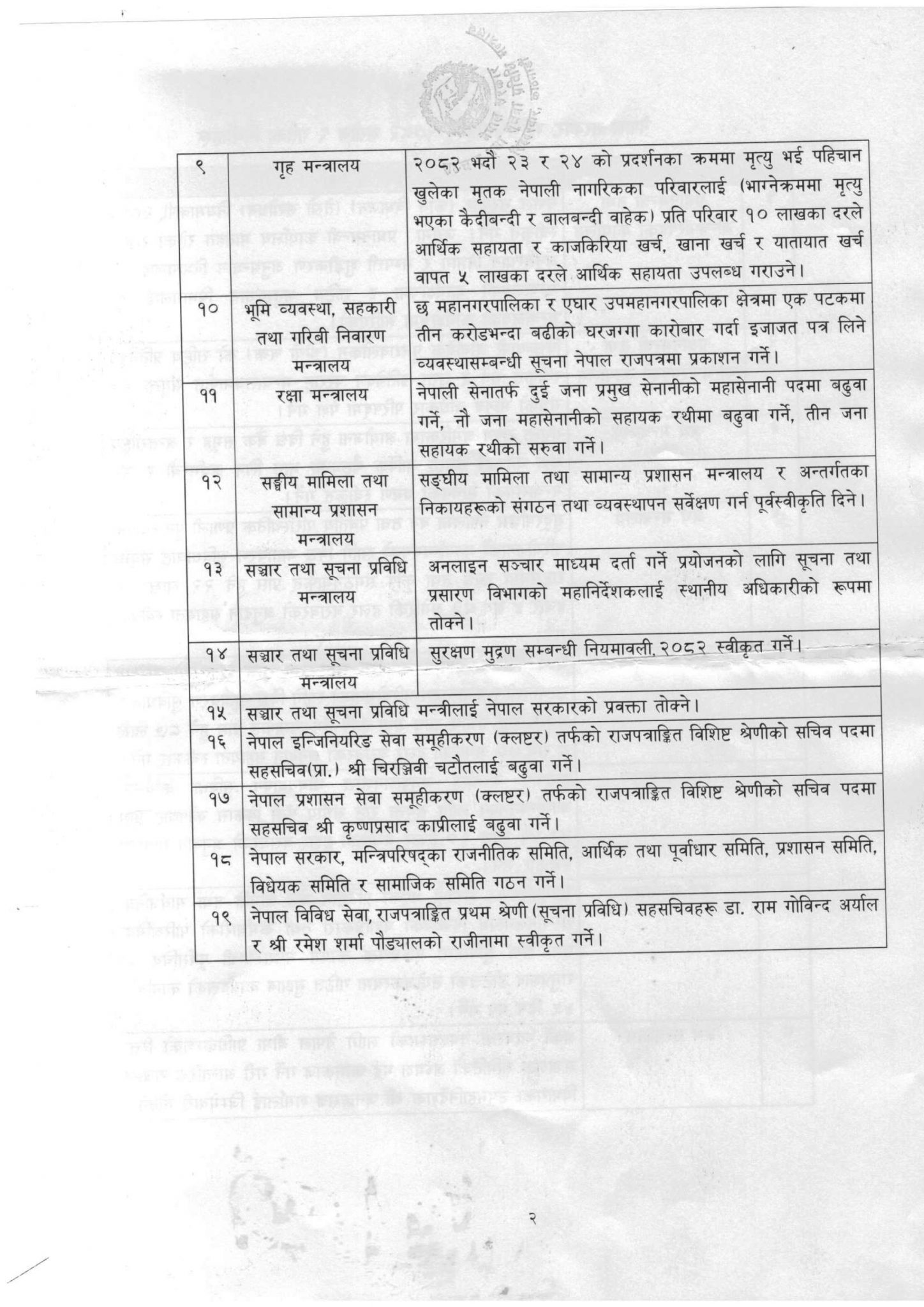 बैठकले नेपाल विविध सेवा, राजपत्रांकित प्रथम श्रेणी सूचना प्रविधितर्फका २ जना सचिवको राजीनामा पनि स्वीकृत गरेको छ । राजीनामा दिनेमा रामगोविन्द अर्याल र रमेश शर्मा रहेका छन् ।