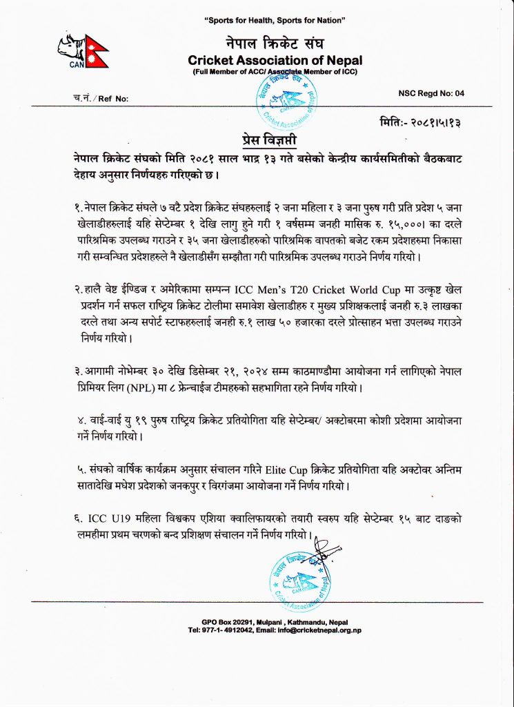 क्यानले ७ वटै प्रदेशका क्रिकेट संघहरूलाई २ जना महिला र ३ जना पुरुष गरी ५ जना खेलाडीलाई पारिश्रमिक दिने निर्णय गरेको हो।