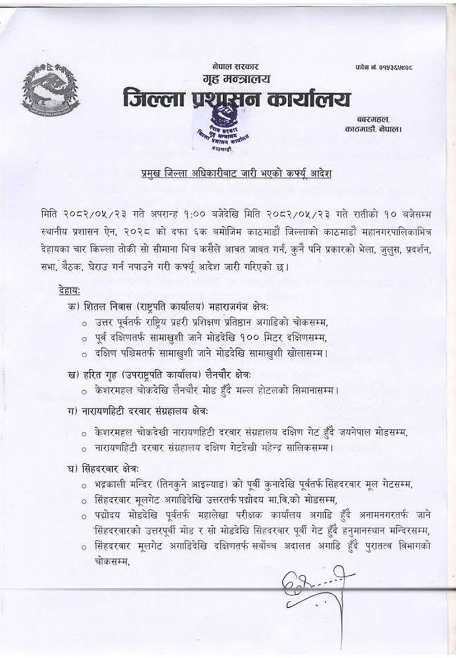 प्रशासनले दिउँसो १ बजेदेखि राष्ट्रपति भवन शीतलनिवास, उपराष्ट्रपति भवन लैनचौर, नारायणहिटी दरबार संग्रहालय क्षेत्र र सिंहदरबार आसपासमा कफ्र्यु लगाएको हो।