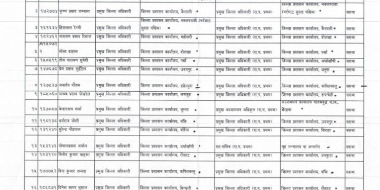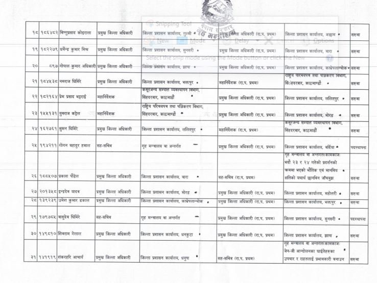 धनुषामा प्रेम प्रसाद लुईँटेल,कपिलवस्तुमा जनार्दन गौतम र रुपन्देहीमा माधव प्रसाद पोखरेललाई सरुवा गरिएको छ । बाँकेमा कार्यरत प्रमुख जिल्ला अधिकारी धर्मराज जोशीलाई उदयपुर, बर्दियामा कार्यरत सुरेन्द्र पौड्याललाई सिराहा र रौतहटमा कार्यरत विनोद कुमार खड्कालाई धनकुटाको प्रजिअमा सरुवा गरिएको छ । बाँकेमा दिल कुमार तामाङ, रौतहटमा निदेश सागर भुषाल र गुल्मीमा आनन्द सारुलाई पठाइएको छ ।