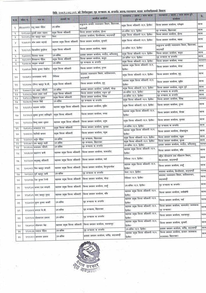 काठमाडौं । गृह मन्त्रालयले १२ प्रमुख जिल्ला अधिकारीसहित ३६ उपसचिवको सरुवा गरिएको छ। गृहले बुधबार सीडीओसहित उपसचिवहरूको सरुवा गरेको हो।