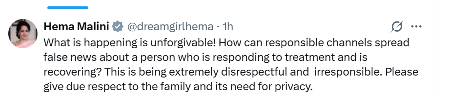 हेमा मालिनीले अगाडि थपिन्, “यो अत्यन्तै अनादरपूर्ण र गैरजिम्मेवारपूर्ण छ। कृपया परिवार र उनीहरूको गोपनीयताको सम्मान गर्नुहोस्।”