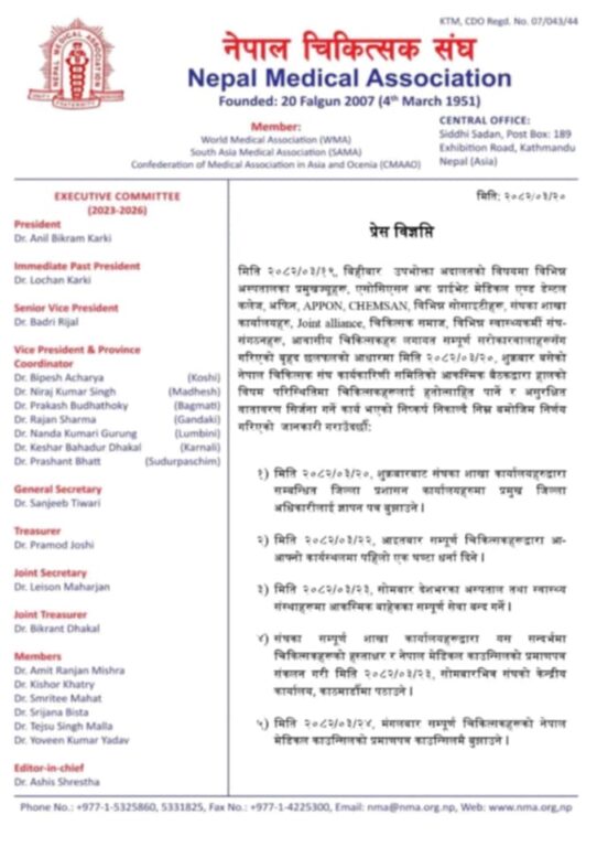संघका महासचिव डा. सञ्जिव तिवारीले शुक्रबार जानकारी दिँदै संघले आकस्मिकबाहेकका सबै स्वास्थ्य सेवा बन्द गर्ने निर्णय गरेको जनाएका छन्। साथै, आगामी असार २४ गते मंगलबार संघका सदस्य चिकित्सकहरू मेडिकल काउन्सिलमा प्रमाणपत्र बुझाउने कार्यक्रमसमेत तय गरिएको छ।