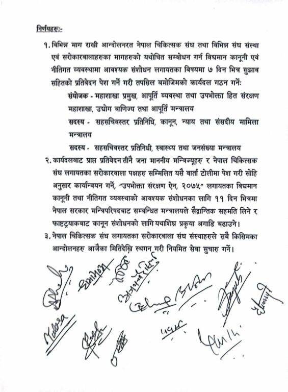 स्वास्थ्य, कानून र उद्योग मन्त्रालयबीच मङ्गलबार राति सम्पन्न छलफलपछि चिकित्सक संघ र सरकारबीच तीन बुँदे सहमति भएको हो। स्वास्थ्य मन्त्रालयमा सम्पन्न बैठकमा संघका पदाधिकारीहरू, स्वास्थ्यमन्त्री प्रदीप पौडेल, कानून मन्त्री अजय चौरसिया र उद्योगमन्त्री दामोदर भण्डारी सहभागी थिए।