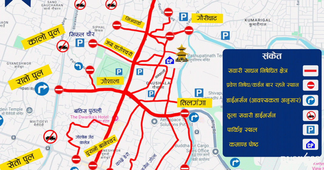 काठमाडौं । बुधबार काठमाडौंको पशुपतिनाथ क्षेत्र आसपासका विभिन्न स्थानमा गाडी चलाउन नपाइने भएको छ । महाशिवरात्रि पर्वको अवसरमा पशुपतिनाथ क्षेत्रमा हुने भिडभाडलाई सुरक्षित एवं व्यवस्थित गर्न काठमाडौ उपत्यका ट्राफिक प्रहरी कार्यालयले यस्तो प्रबन्ध गरेको हो ।