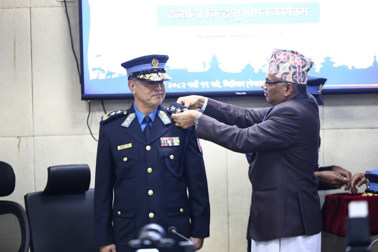 काठमाडौं । नेपाल प्रहरीका नवनियुक्त महानिरीक्षक(आईजीपी)चन्द्रकुवेर खापुङलाई दर्ज्यानी चिह्न प्रदान गरिएको छ। बिहीबार बिहान गृहमन्त्रालयमा आयोजित कार्यक्रममा गृहसचिव गोकर्णमणि दुवाडीले आईजीपी खापुङलाई दर्ज्यानी चिह्न लगाइदिएका हुन्।