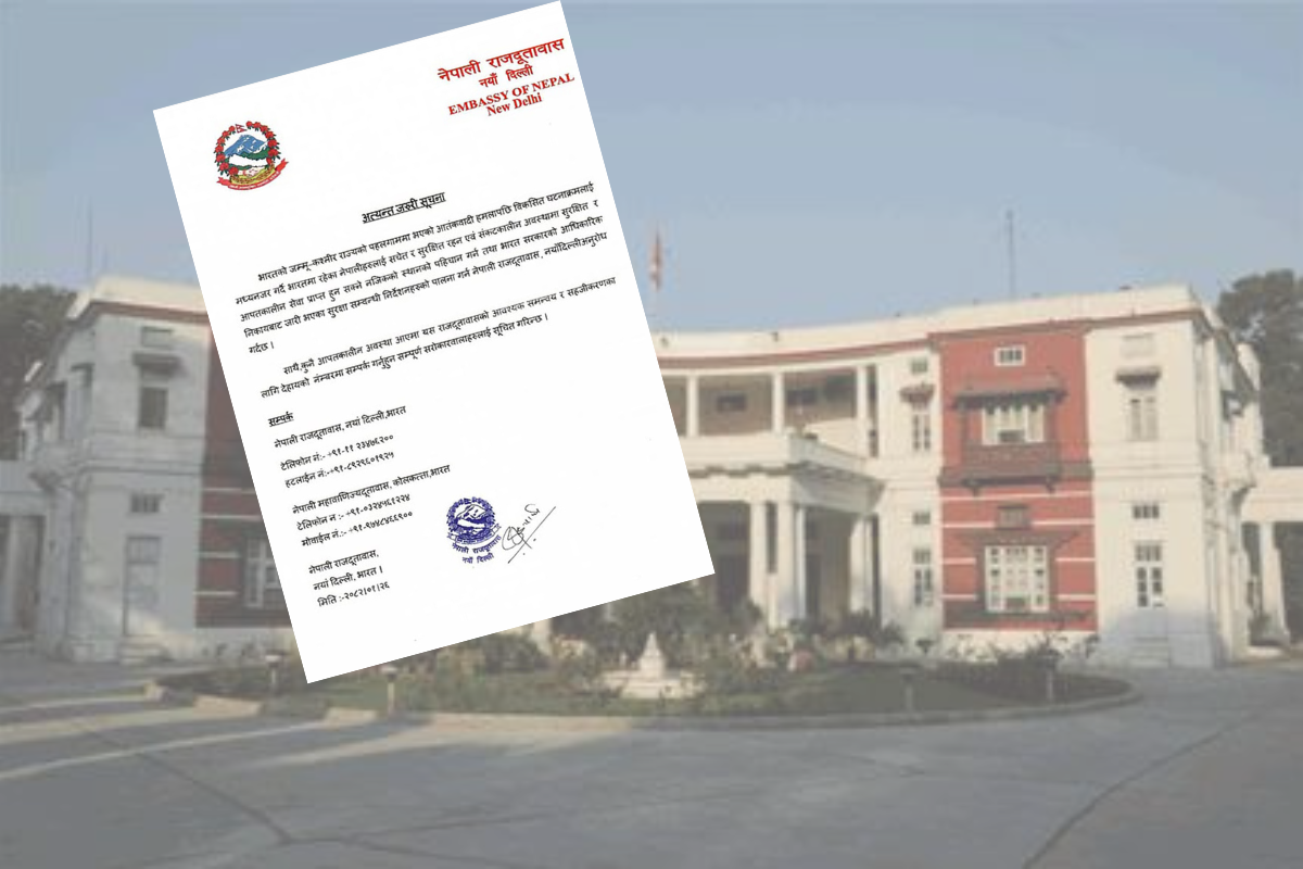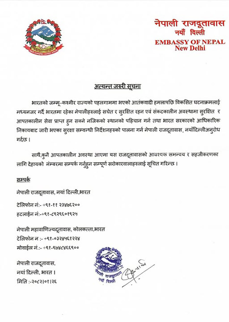 दूतावासले शुक्रबार यससम्बन्धी सूचना जारी गरेको छ । ‘भारतको जम्मु–कश्मीर राज्यको पहलगाममा भएको आतंकवादी हमलापछि विकसित घटनाक्रमलाई मध्यनजर गर्दै भारतमा रहेका नेपालीहरूलाई सचेत र सुरक्षित रहन एवं संकटकालीन अवस्थामा सुरक्षित आपतकालीन सेवा प्राप्त हुन सक्ने नजिकको स्थानको पहिचान गर्न तथा भारत सरकारको आधिकारिक निकायबाट जारी भएका सुरक्षासम्बन्धी निर्देशनहरूको पालना गर्न नेपाली दूतावास, नयाँदिल्ली अनुरोध गर्दछ,’ दूतावासको सूचनामा भनिएको छ ।