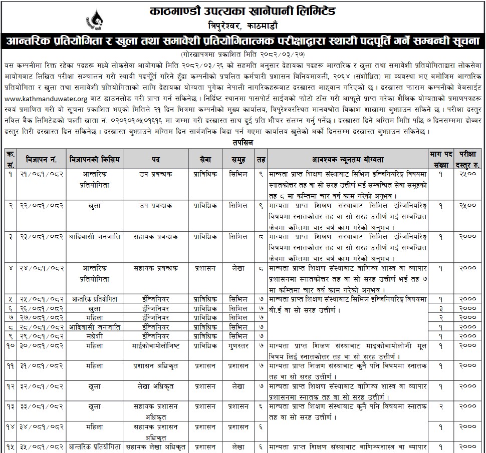 त्यस्तै, काठमाडौँ उपत्यका खानेपानी लिमिटेडले पनि ५२ जना कर्मचारी माग गर्दै दरखास्त आह्वान गरेको छ। काठमाडौँ उपत्यका खानेपानी लिमिटेड पदपूर्ति समितिले आज सूचना प्रकाशित गर्दै आन्तरिक प्रतिस्पर्धा र खुला तथा समावेशी प्रतियोगिताबाट पदपूर्ति गरिने जनाएको हो।