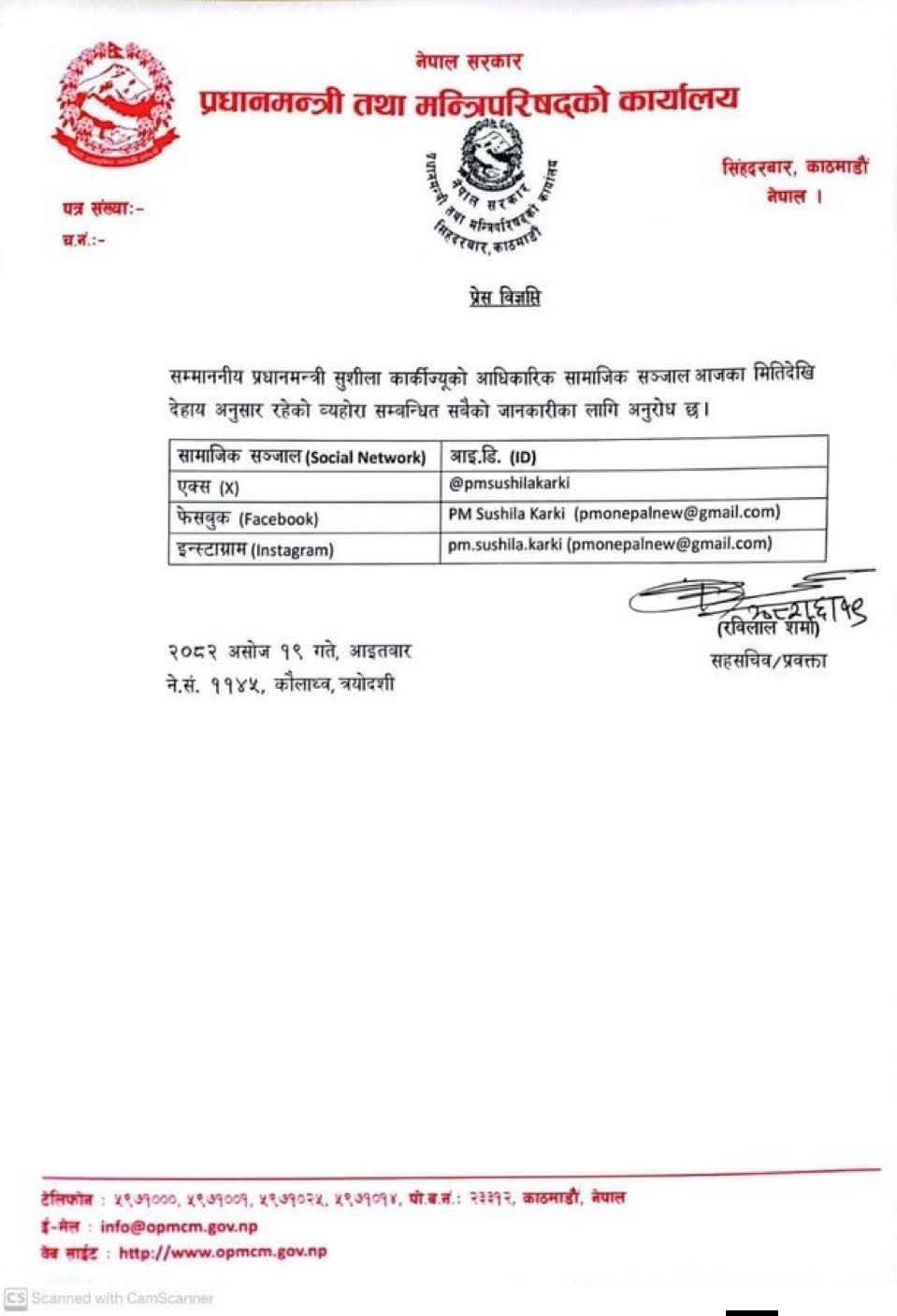 प्रधानमन्त्री कार्यालयले आइतबारदेखि PM Sushila Karki फेसकुब र @pmsushilakarki सञ्चालनमा ल्याएको छ ।