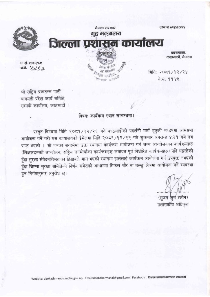 काठमाडौँ जिल्ला प्रशासन कार्यालयले आइतबार विज्ञप्ति जारी गर्दै शिक्षकहरुको आन्दोलन र राष्ट्रिय जनमोर्चाको पूर्व निर्धारित कार्यक्रम त्यही भएकाले सुरक्षा संवेदनशिलताका हिसाबले राप्रपालाई पनि त्यही कार्यक्रम गर्न अनुमति दिन नसकिने बताएको हो।
