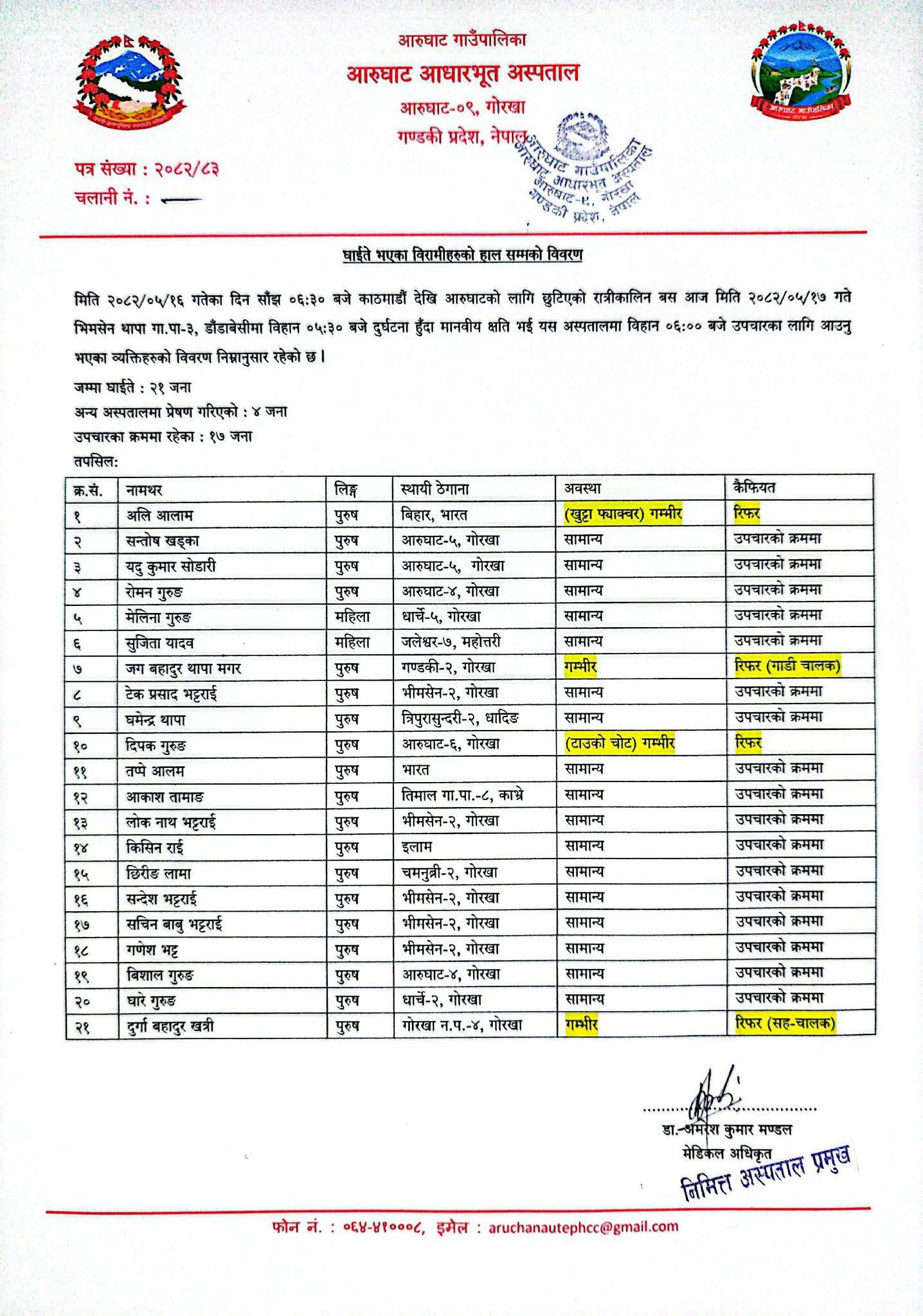 काठमाडौं । काठमाडौंबाट गोरखाको आरुघाट सोतीतर्फ आउँदै गरेको रात्रिबस दुर्घटना हुँदा २१ जना घाइते भएका छन्।