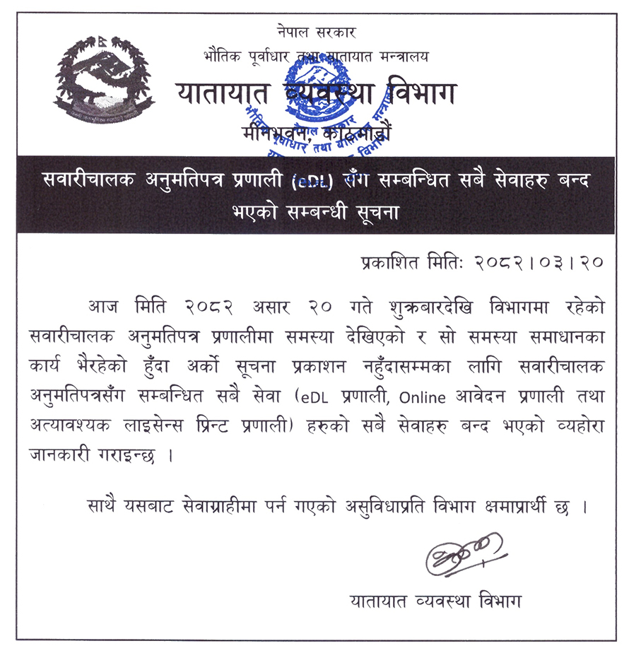 विभागको सूचनामा भनिएको छ,’सवारी चालक अनुमतिपत्रसँग सम्बन्धित सबै सेवा (ईडीएल प्रणाली, अनलाइन आवेदन प्रणाली तथा अत्यावश्यक लाइसेन्स प्रणाली) हरू बन्द भएको व्यहोरा जानकारी गराइन्छ ।’