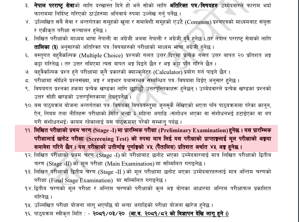 लोकसेवा आयोगले आर्थिक २०८१/८२ को विज्ञापनदेखि लागु हुने गरी सार्वजनिक गरेको पाठ्यक्रममा अब १०० अंकको प्रारम्भिक चरणको परीक्षामा पास भएर दोस्रो चरणको लिखित परीक्षमा सहभागी हुन ४५ अंक ल्याउनैपर्ने व्यवस्था गरेको हो ।