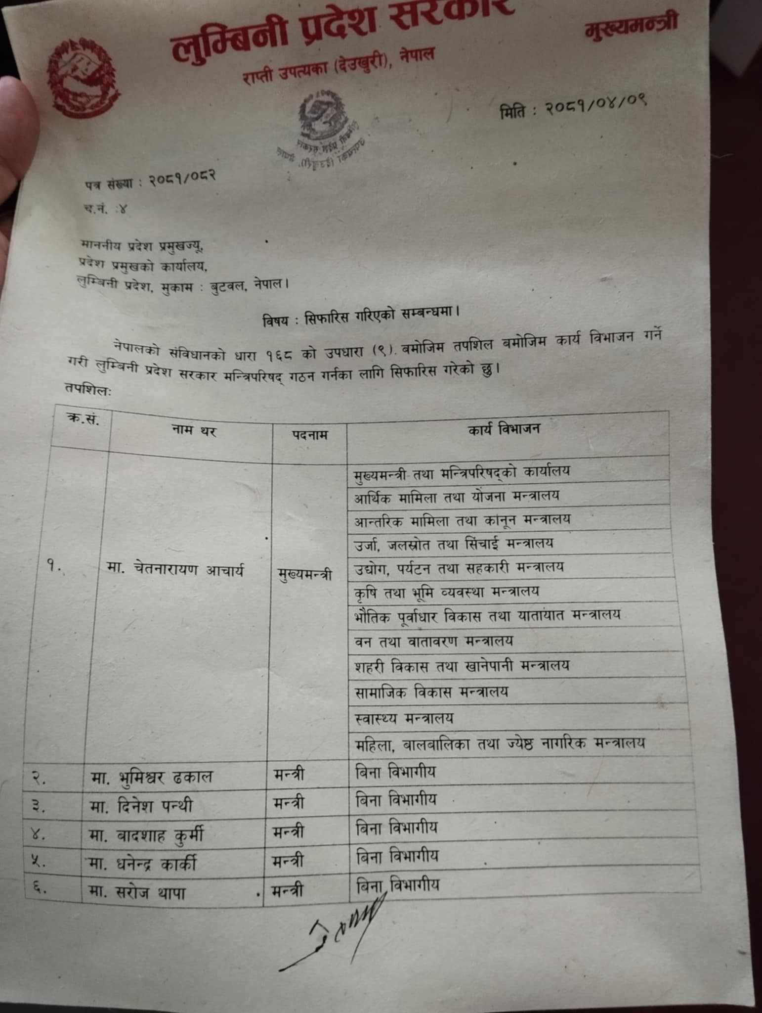 लुम्बिनीमा एमाले कांग्रेसका ५६ सांसदको हस्ताक्षरमा सोमबार एमालेका चेतनारायण आचार्य मुख्यमन्त्री बनेका थिए । यहाँ रहेका लोसपा, नाउपा, जनमत, जसपा, जसपा नेपाल, राप्रपाले सरकारलाई समर्थन गर्ने मौखिक सहमति जनाएपनि अहिलेसम्म सहभागी छैनन् तर उनीहरुका लागि २ मन्त्रालय खाली राखिएको छ ।