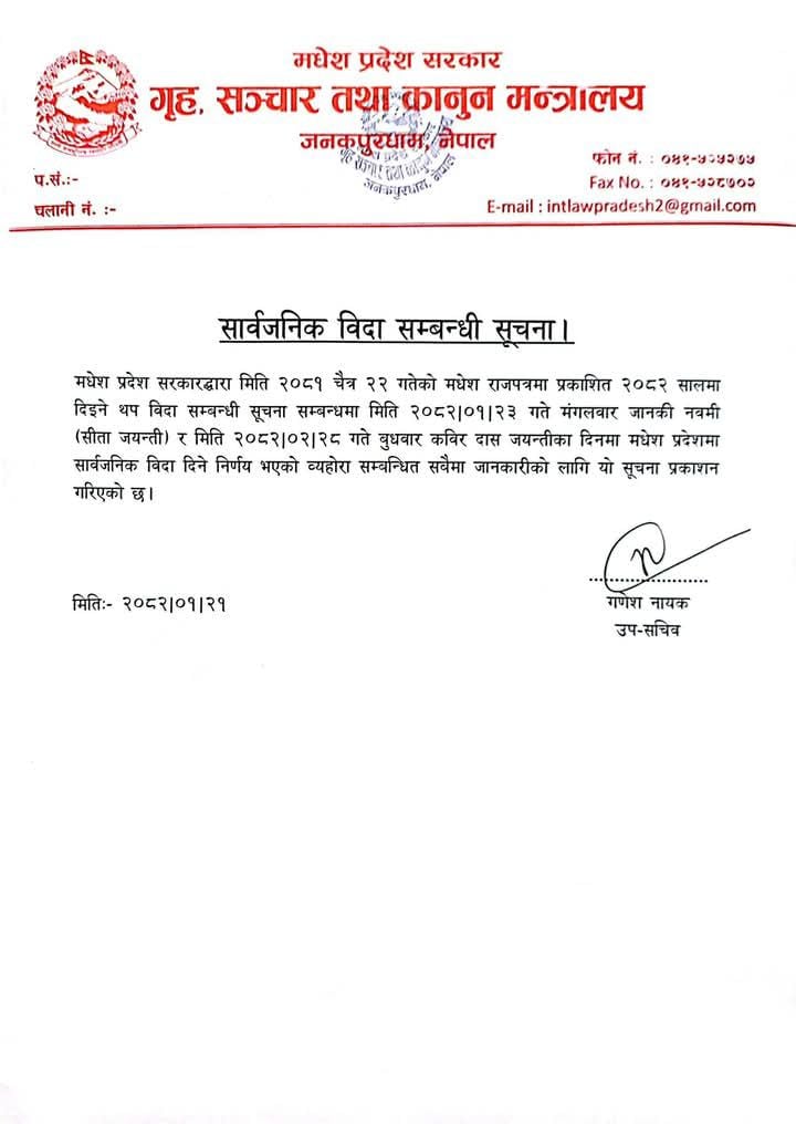 मन्त्रालयले जारी गरेको सूचनामा भनिएको छ,‘ चैत २२ गतेको मधेश राजपत्रमा प्रकाशित २०८२ सालमा दिइने थप विदा सम्बन्धी सूचना सम्बन्धमा भोलि मंगलवार जानकी नवमी (सीता जयन्ती) का दिनमा धेश प्रदेशमा सार्वजनिक विदा दिने निर्णय भएको छ ।’
