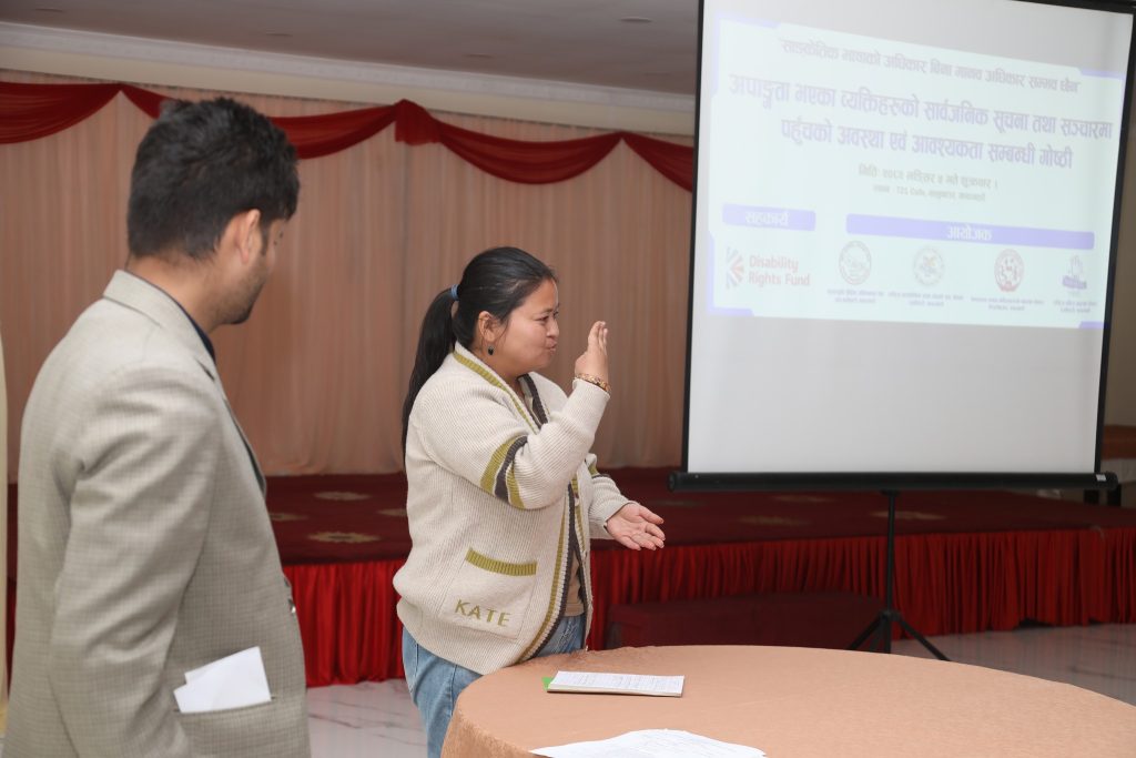 राष्ट्रिय बहिरा महासंघ नेपाल, राष्ट्रिय सांकेतिक भाषा दोभाषे संघ, अपांगता भएका महिलाहरूको महासंघ नेपाल र बहिरा–दृष्टिविहीन अभिभावक समाजको संयुक्त आयोजनामा तथा अपांगता अधिकार कोषको सहयोगमा शुक्रबार काठमाडौंमा आयोजित गोष्ठीमा अपांगता भएका व्यक्तिहरूको सूचनामा पहुँच, उनीहरूले भोग्दै आएका चुनौती र आवश्यकताबारे गम्भीर छलफल भएको थियो ।