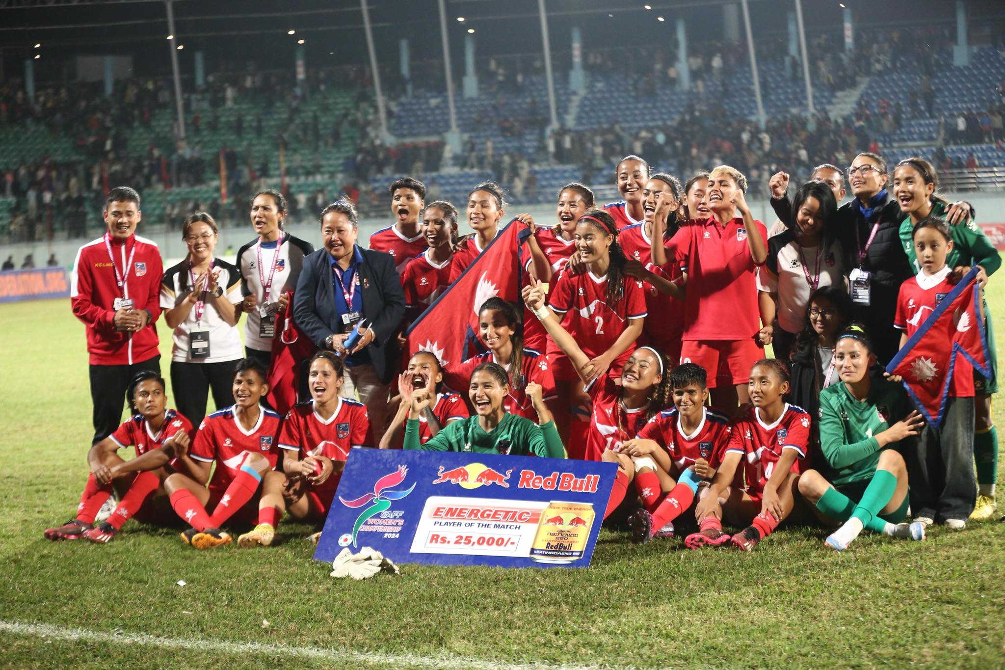 नेपालकी प्रीति राईले गरेको गोलमा सुरुमा रेफ्रिले गोलको मान्यता दिएपनि भारतले प्रोटेष्ट गरेपछि उक्त गोलले मान्यता पाएको थिएन । त्यसपछि खेल रोकिएको थियो । रोकिएको १ घन्टापछि खेल सुरु भएको थियो । खेल सुरु भएको एक मिनेट भित्रै नेपालीकी सावित्रा भण्डारीले बराबरी गोल फर्काएकी थिइन् । नेपालले अब उपाधिका लागि बंगलादेशसंग खेल्नेछ ।