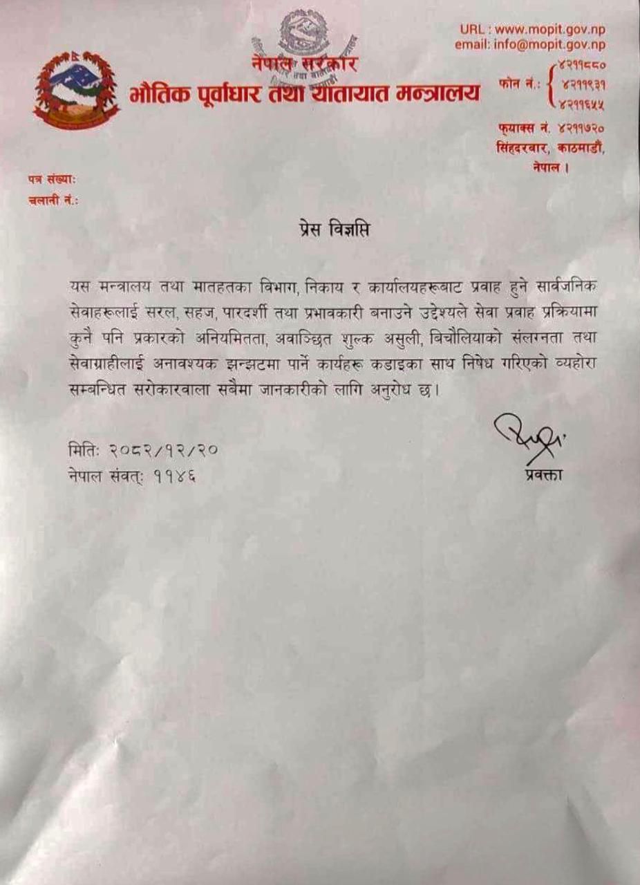 काठमाडौं । भौतिक पूर्वाधार तथा यातायात मन्त्रालयले मन्त्रालय तथा मातहतका निकायहरूबाट प्रवाह हुने सार्वजनिक सेवामा कुनै पनि प्रकारको अनियमितता, अवाञ्छित शुल्क असुली र बिचौलियाको संलग्नता कडाइका साथ निषेध गरेको जनाएको छ।
