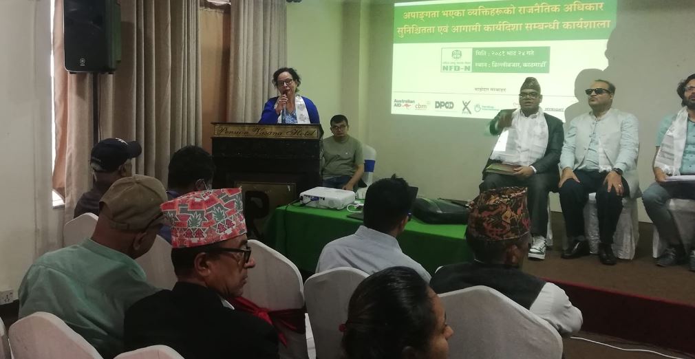 राष्ट्रिय अपांग महासंघ नेपालले सोमबार काठमाडौंमा आयोजना गरेको ‘अपांगता भएका व्यक्तिहरुको राजनीतिक अधिकार सुनिश्चितता एवं आगामी कार्यदिशा’ विषयक कार्यशाला गोष्ठीमा सहभागीहरुले अपांगता भएका व्यक्तिहरुको राजनीतिक प्रतिनिधित्वको अधिकार सुनिश्चित गरी समतामूलक समाज निर्माण गर्न माग गरेका हुन् ।