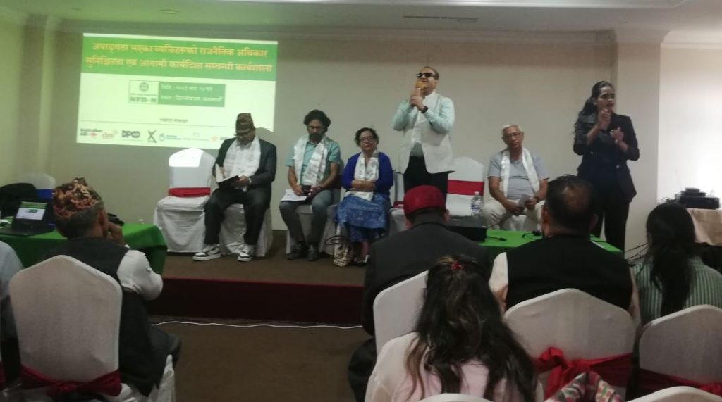 काठमाडौं । आगामी २०८४ सालको निर्वाचनमा अपांगता भएका व्यक्तिहरुको राजनीतिक प्रतिनिधित्व सुनिश्चित गर्न माग गरिएको छ ।