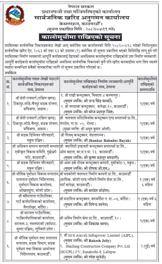कार्यालयले आज सूचना जारी गर्दै विभिन्न निकायबाट कालो सूचीमा राख्नको लागि लेखि पठाएअनुसार ती निर्माण कम्पनीलाई कालो सूचीमा राखिएको कार्यालयले जानकारी दिएको हो।