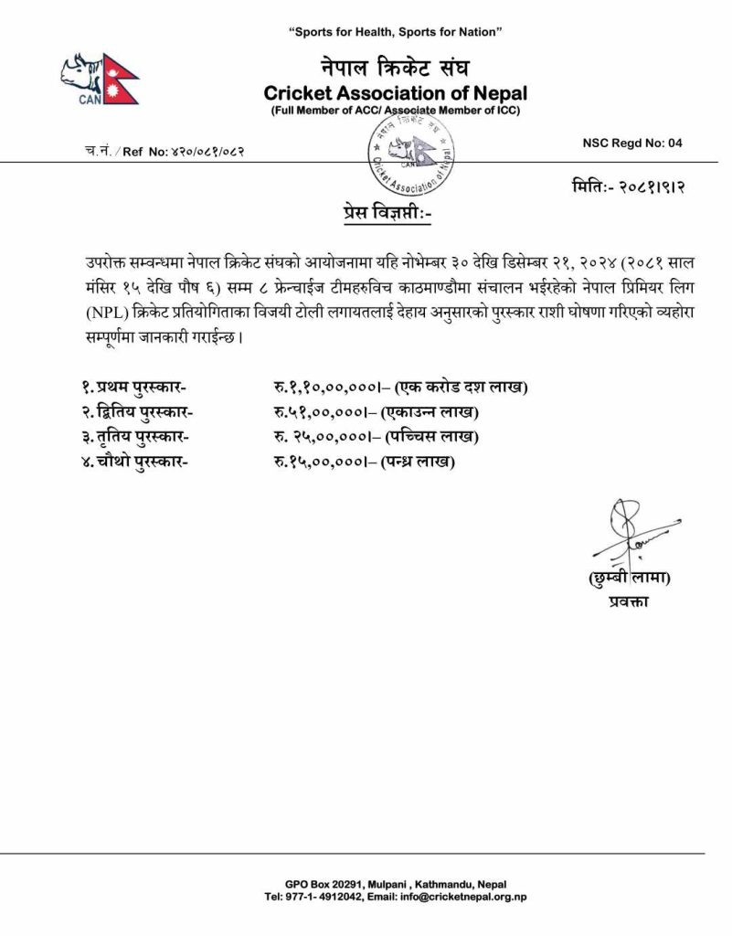 काठमाडौं । नेपाल प्रिमियर लिग (एनपीएल)को विजेताले एक करोड १० लाख रुपैयाँ प्राप्त गर्ने भएको छ । मंगलबार नेपाल क्रिकेट संघ (क्यान)ले एक विज्ञप्तिमार्फत जारी प्रतियोगितामा प्लेअफमा पुगेका टिमले पाउने पुरस्कारबारे जानकारी गराएको हो ।