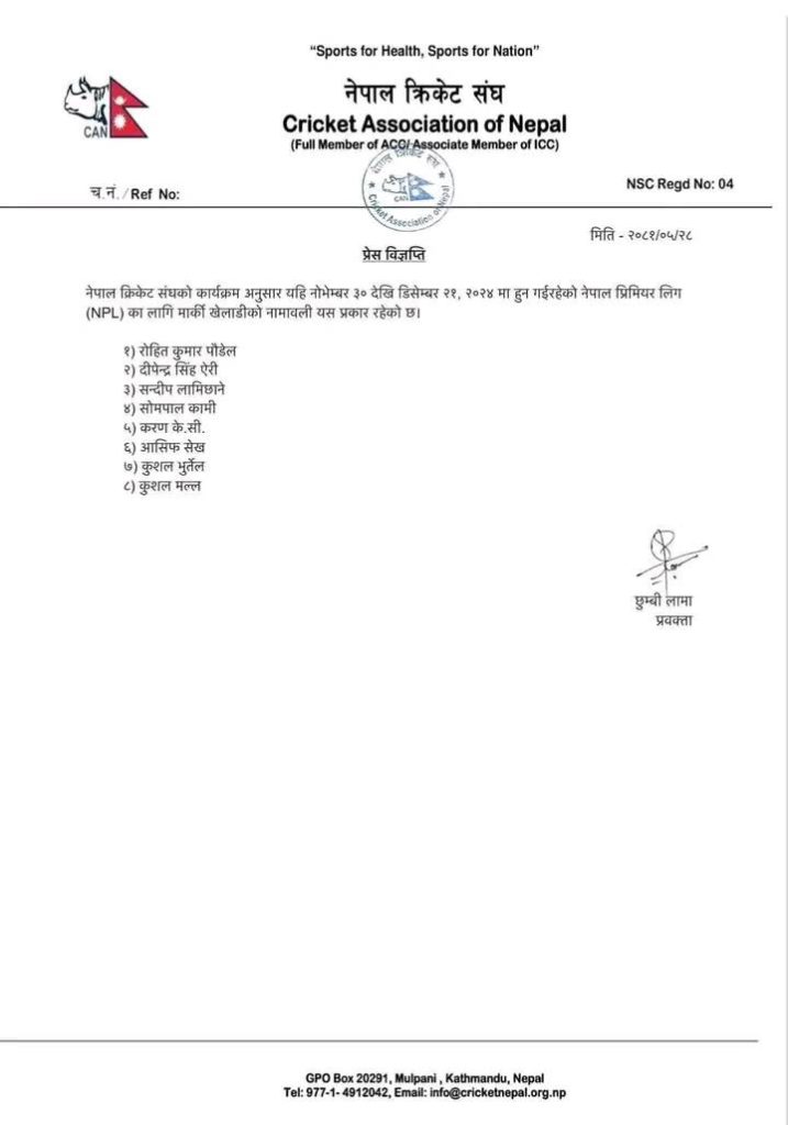 जसमा नेपाली राष्ट्रिय क्रिकेट टिममा कप्तान रोहितकुमार पौडेल, दीपेन्द्र सिंह ऐरी, सन्दीप लामिछाने, सोमपाल कामी छन् । यस्तै, करण केसी, आसिफ सेख, कुशल भुर्तेल र कुशल मल्ल मार्की खेलाडीको सूचीमा अटाएका छन् ।