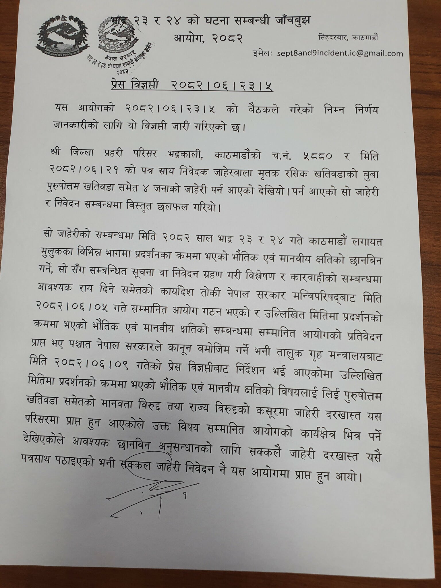 साथै, आयोगले फौजदारी घटनाको अनुसन्धान गर्नका लागि आफ्नो प्रतिवेदन कुर्नु नपर्ने समेत स्पष्ट पारेको छ। ‘फौजदारी वारदातमा अनुसन्धान तहकिकातको कार्य गर्न गराउन यस आयोगको प्रतिवेदन कुर्न नपर्ने व्यहोराको जाहेरी निवेदन र कागजात जिल्ला प्रहरी परिसर काठमाडौंमा फिर्ता पठाइदिने,’ आयोगको सूचनामा उल्लेख छ।