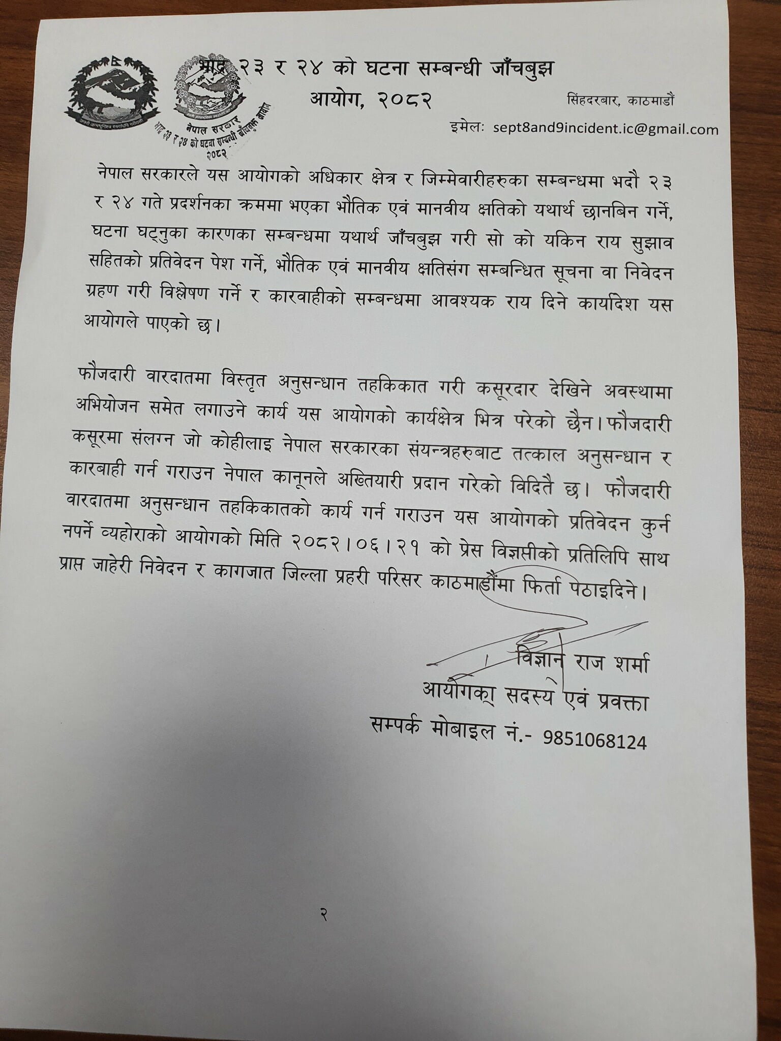 आयोगका सदस्य एवं प्रवक्ता विज्ञानराज शर्माद्वारा जारी विज्ञप्तिमा भनिएको छ, ‘फौजदारी वारदातमा विस्तृत अनुसन्धान तहकिकात गरी कसुरदार देखिने अवस्थामा अभियोजनसमेत लगाउने कार्य यस आयोगको कार्यक्षेत्रभित्र परेको छैन।’