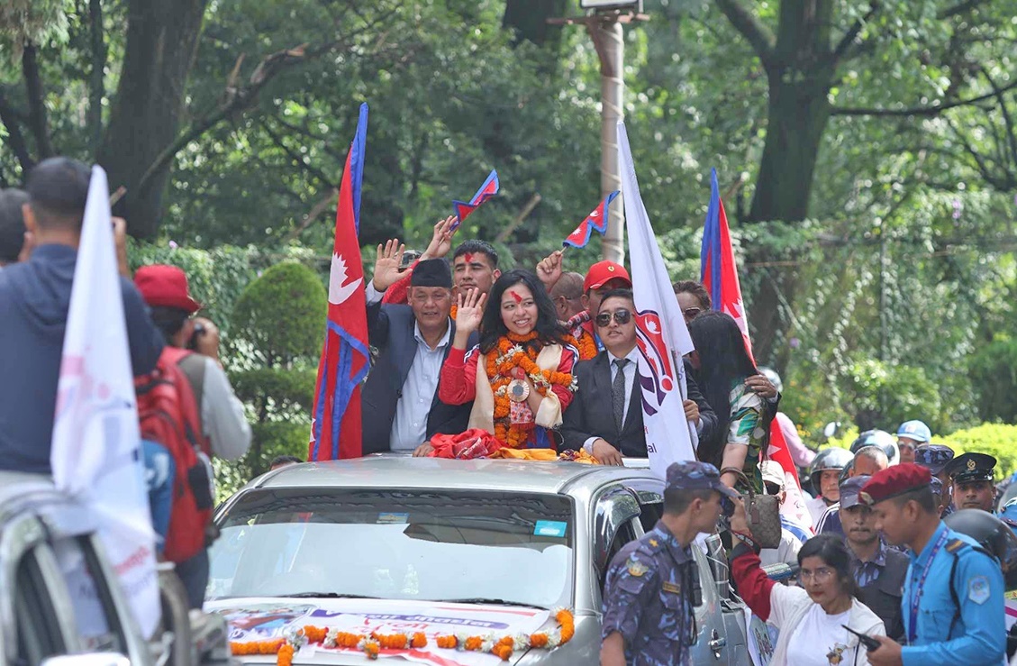 काठमाडौं । पेरिस पारालिम्पिककी ऐतिहासिक पदक विजेता तेक्वान्दो खेलाडी पलेसा गोवर्धनलाई नगर परिक्रमा गराएर सम्मान गरिएको छ ।