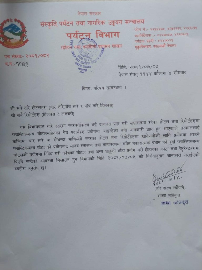 ती होटल र रिसोर्टहरूले अब काँचका बोटल तथा अन्य धातुको भाँडा प्रयोग गरी होटलका कोठा तथा रेस्टुराँमा पिउने पानीको व्यवस्था मिलाउनुपर्ने विभागले यही कात्तिक ५ गते पत्रमार्फत जानकारी गराएको छ।